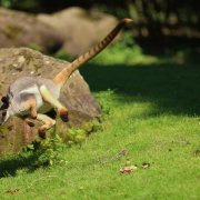Plus discret, il évolue avec une aisance remarquable sur les terrains escarpés, utilisant sa longue queue comme balancier naturel.